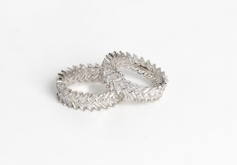 As pedras em lapidação baguete seguem um padrão dinâmico, criando um brilho que muda conforme a luz.