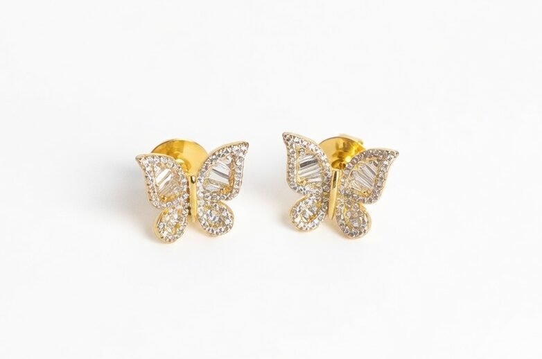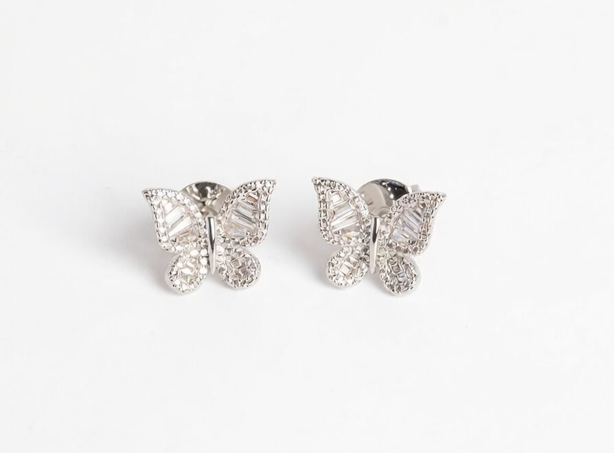 Este brinco em formato de borboleta combina pedras em lapidação baguete no interior com o contorno totalmente cravejado, criando um contraste elegante.