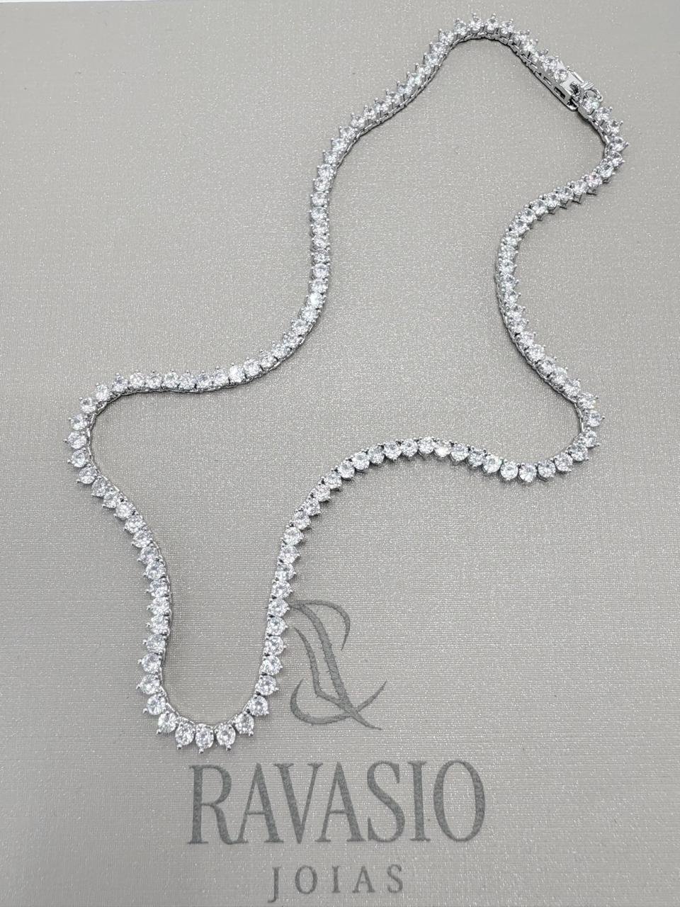 Com 40 cm de comprimento, posiciona-se com delicadeza junto ao colo, valorizando o contorno com um caimento sofisticado e envolvente.